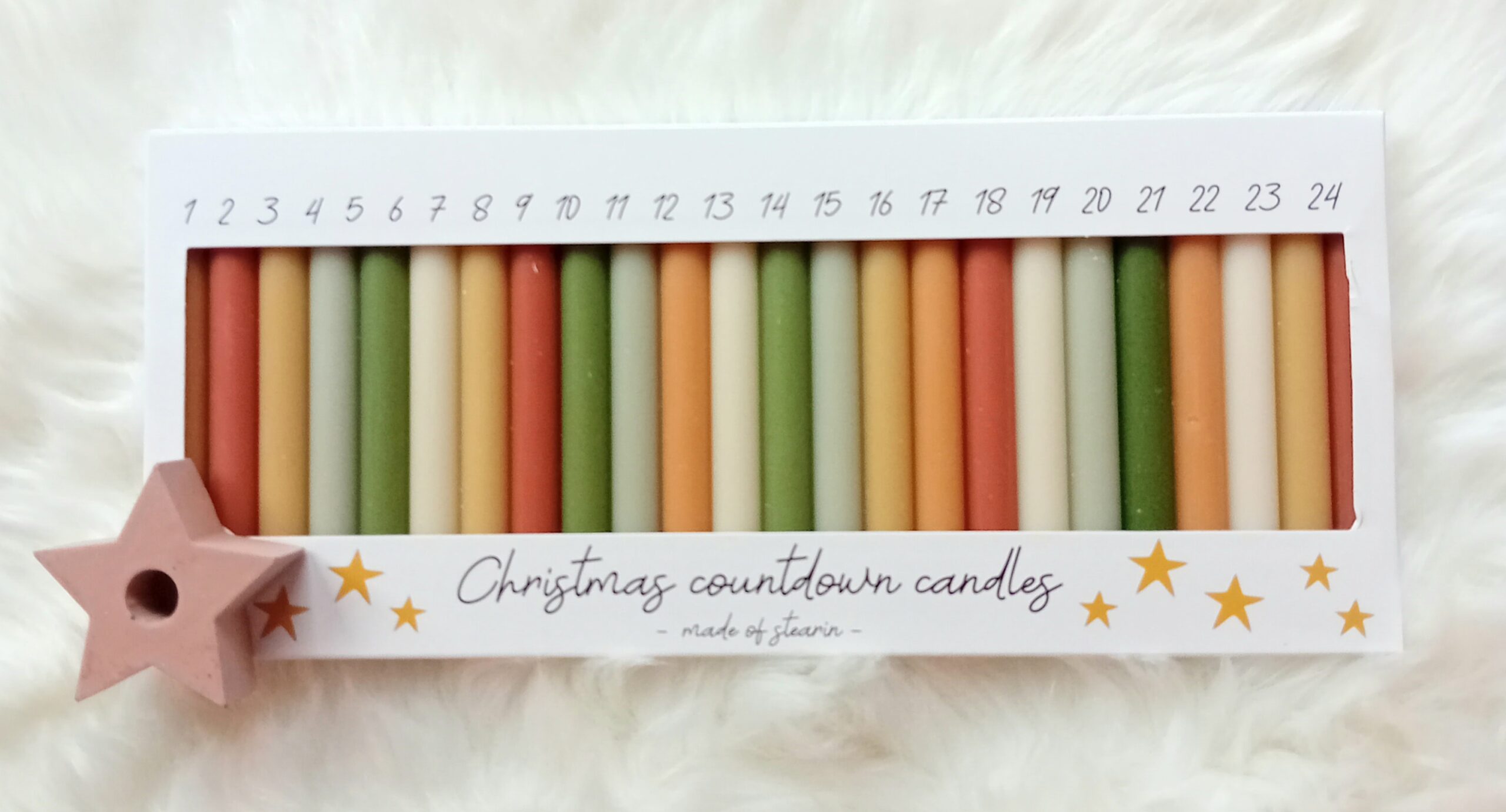| Artikel | Vier advent kaarsen, 24 advent kaarsen, ster houder |